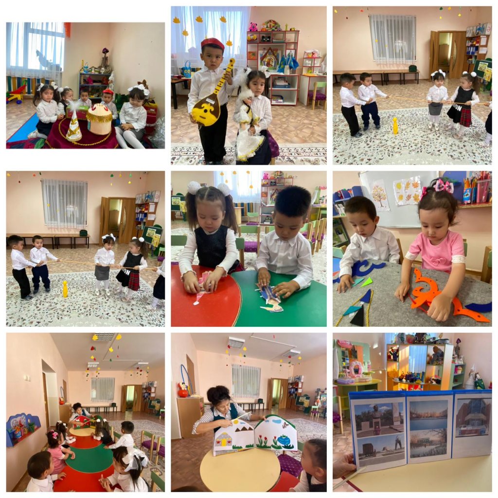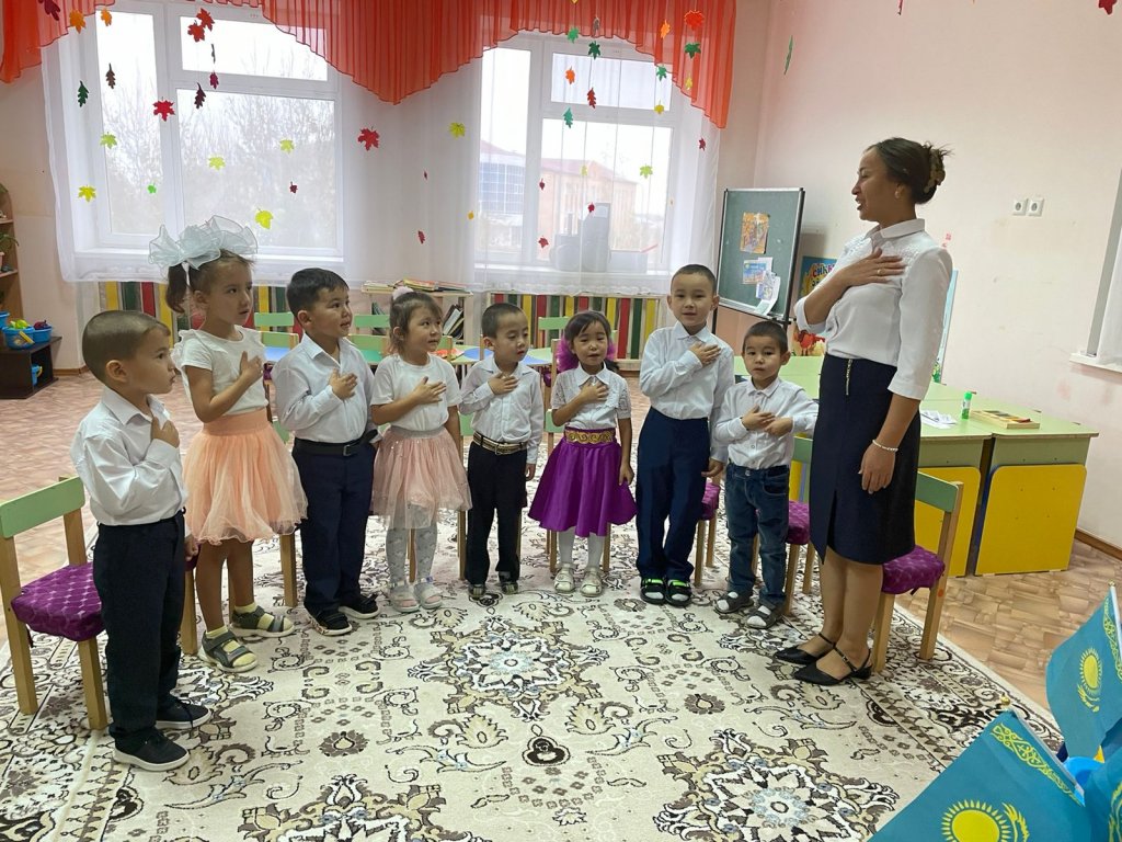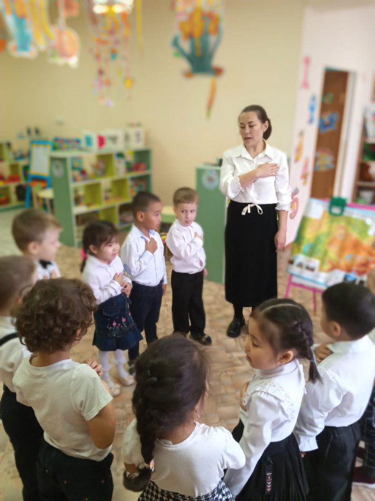 Тәрбие сағатын Әнұранмен бастап, балалар Қазақстан Республикасы жайлы әртүрлі суреттер, қазақтың салт-дәстүрлері, ұлттық ойындарын ойнау арқылы көптеген мәліметтерді ала білді. Атап өтсек: «Кілемді әсемде», «Киіз үй» лэпбугі, үстел үсті: «Оюларды сәкестендір», «Салт-дәстүрдің көлеңкесін тап», «Оюлар пазлы».